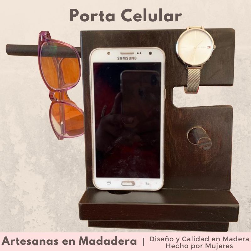 Peculiar Porta Celular hecho en Madera de pino barnizada, también es porta reloj, porta lentes y porta anillos en color chocolate.